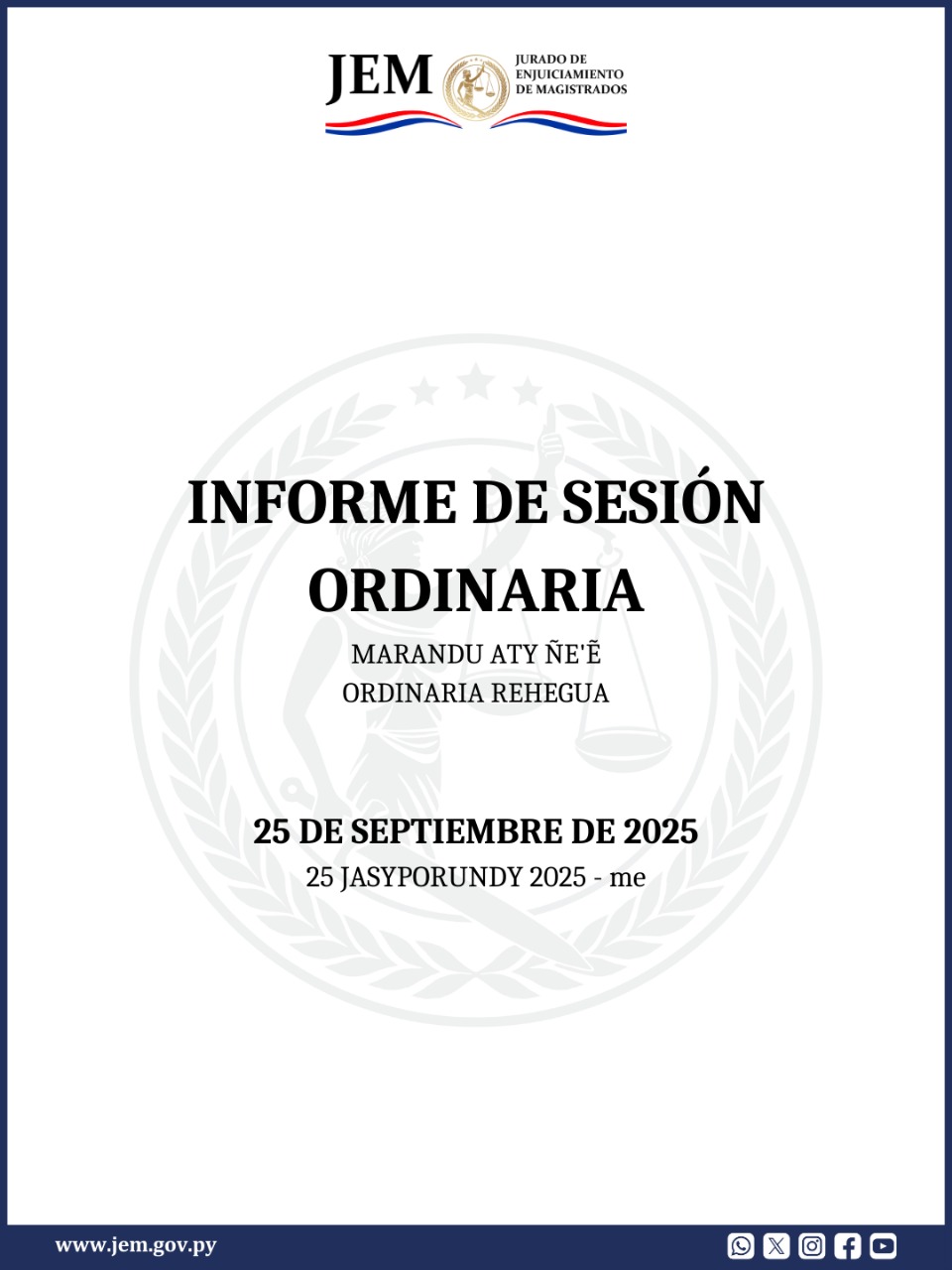 - El JEM toma conocimiento de los antecedentes de referencia y una vez cumplido el plazo, el Pleno pueda expedirse sobre el análisis de la viabilidad respecto al inicio de oficio de una investigación preliminar o de un enjuiciamiento conforme a lo establecido en el Art. 18 de la Ley n.° 6814/2021. El plazo para el efecto se cumplirá el 24 de octubre de 2025.